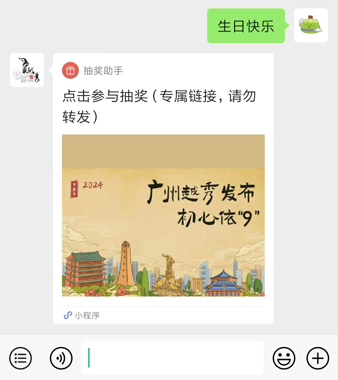 参与方式二:点击下方名片,关注“广州越秀发布”微信公众号,后台发送关键词“生日快乐”进入抽奖。我们将抽取20位粉丝,各送出定制台历1本。