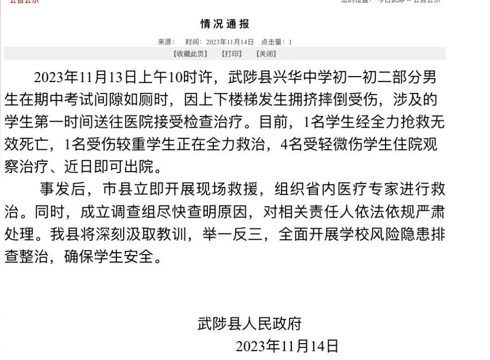 2023年11月13日上午10时许,武陟县兴华中学初一初二部分男生在期中考试间隙如厕时,因上下楼梯发生拥挤摔倒受伤,涉及的学生第一时间送往医院接受检查治疗。目前,1名学生经全力抢救无效死亡,1名受伤较重学生正在全力救治,4名受轻微伤学生住院观察治疗、近日即可出院。