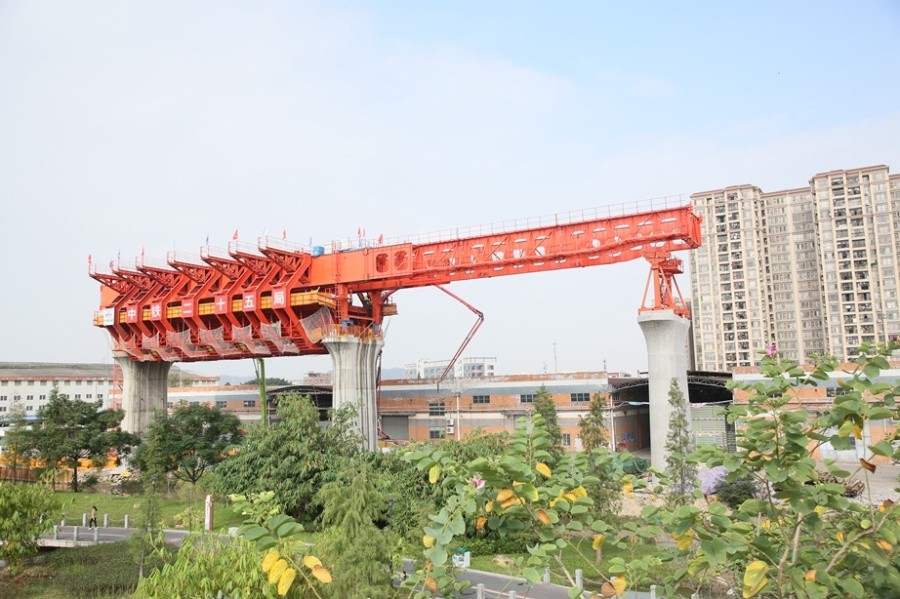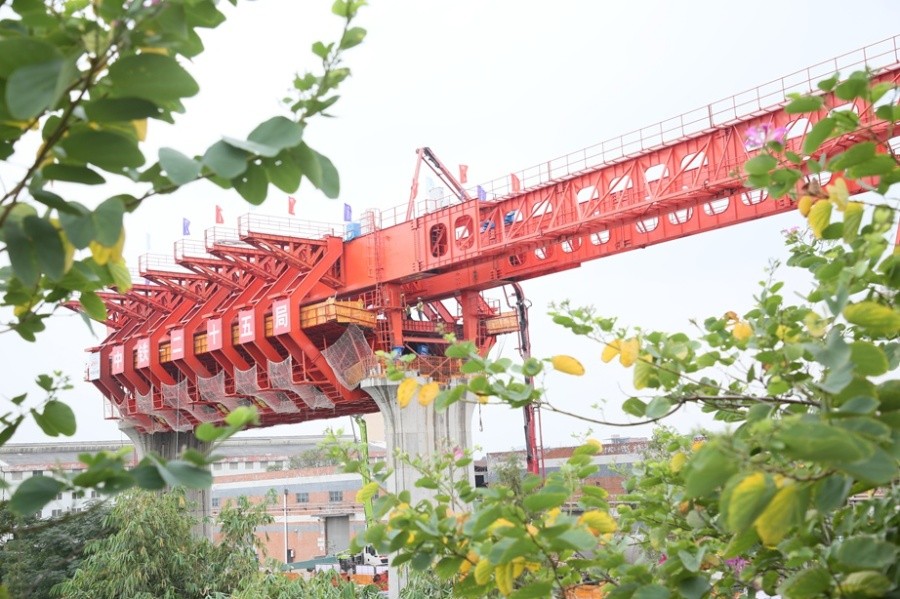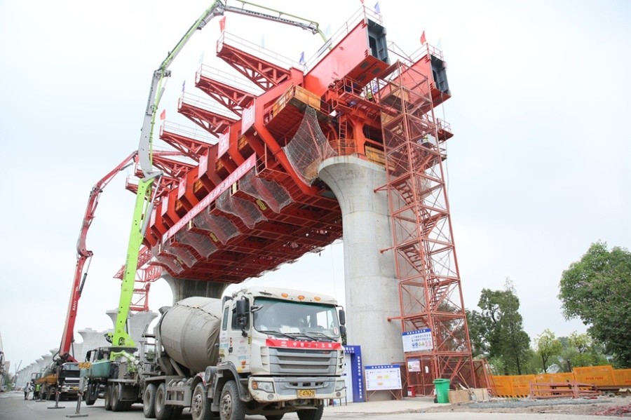此次完成浇筑的是高中立交特大桥79号至80号墩箱梁,跨度32.6米,梁体重达946吨。“高中立交特大桥全长5.1公里,该桥24号墩到82号墩与居民区相邻,为降低高铁行驶带来的噪声影响,该区域设置2.4公里圆形全封闭式声屏障,类似用一个巨大的罩子将噪音和居民隔离开,最大限度发挥降噪作用,这是项目践行绿色环保理念的重要举措。”中铁二十五局现场负责人刘江涛介绍。