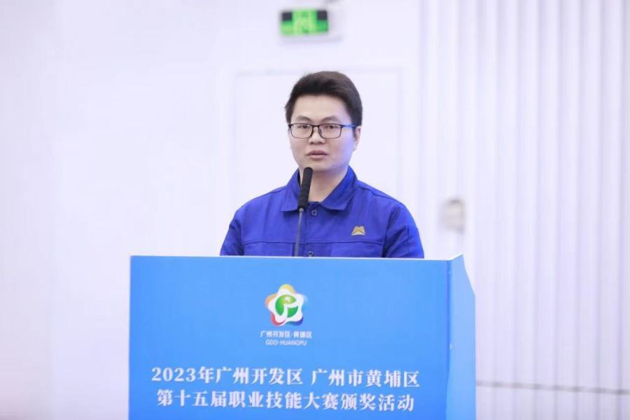 颁奖仪式上,来自国机智能科技有限公司的钟乐华代表获奖选手发言。他说,自己深刻感受到黄埔区和公司对人才成长提供的强大后盾,“我们这些普通工人有机会通过技能培训和竞赛成为备受欢迎的人才,有了更多的发展机会、更美好的前景。”他承诺,将不断学习提高自身技能水平和综合素质,为企业和黄埔区高质量发展贡献力量。