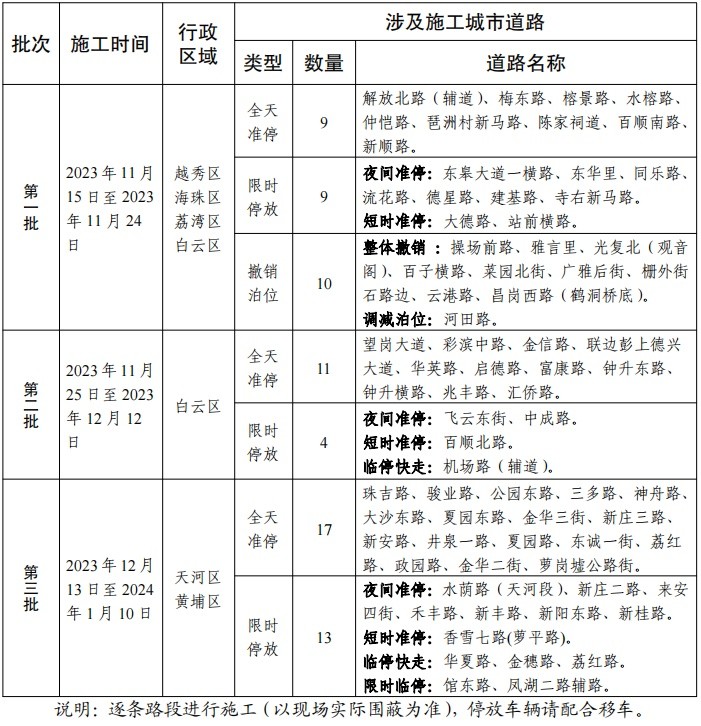 一、2023年11月15日至2023年11月24日(第一批)28条路段施工,主要涉及越秀区、海珠区、荔湾区的城市道路及白云区部分城市道路。其中,划设9条全天准停路段,9条限时停放区域路段,撤销10条路段影响通行的泊位。