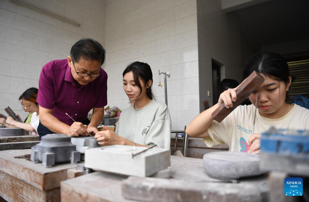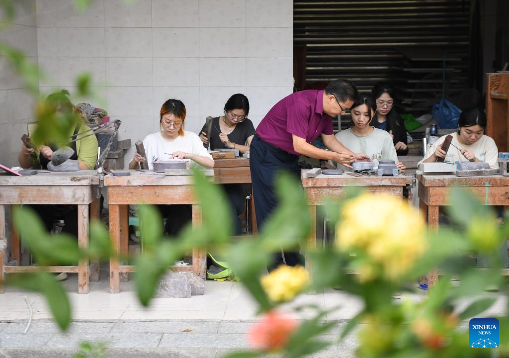 Liu Xinxiang (C) introduces the carving of Duan inkstone to an apprentice at a Duan inkstone cultural village in Zhaoqing City, south China's Guangdong Province, Oct. 26, 2023. (Xinhua/Deng Hua)