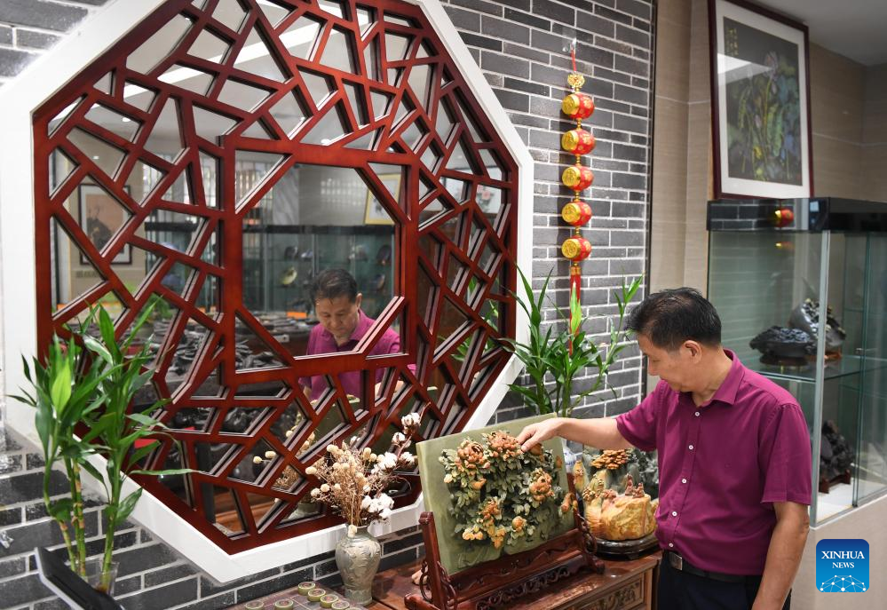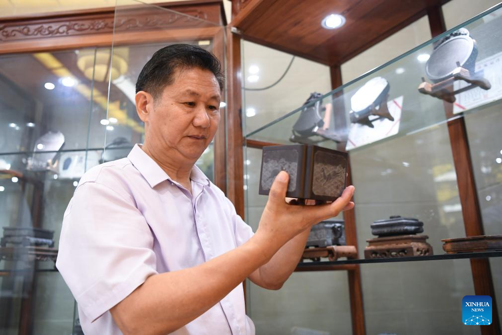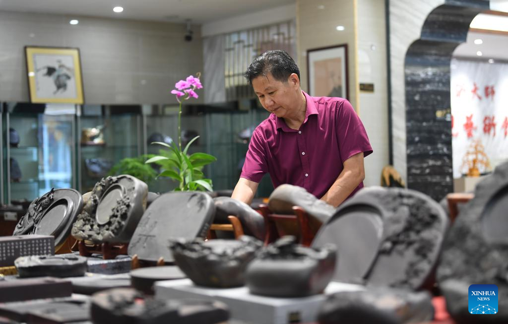 Liu Xinxiang arranges Duan inkstones at his Duan inkstone art gallery in Zhaoqing City, south China's Guangdong Province, Oct. 26, 2023. (Xinhua/Deng Hua)