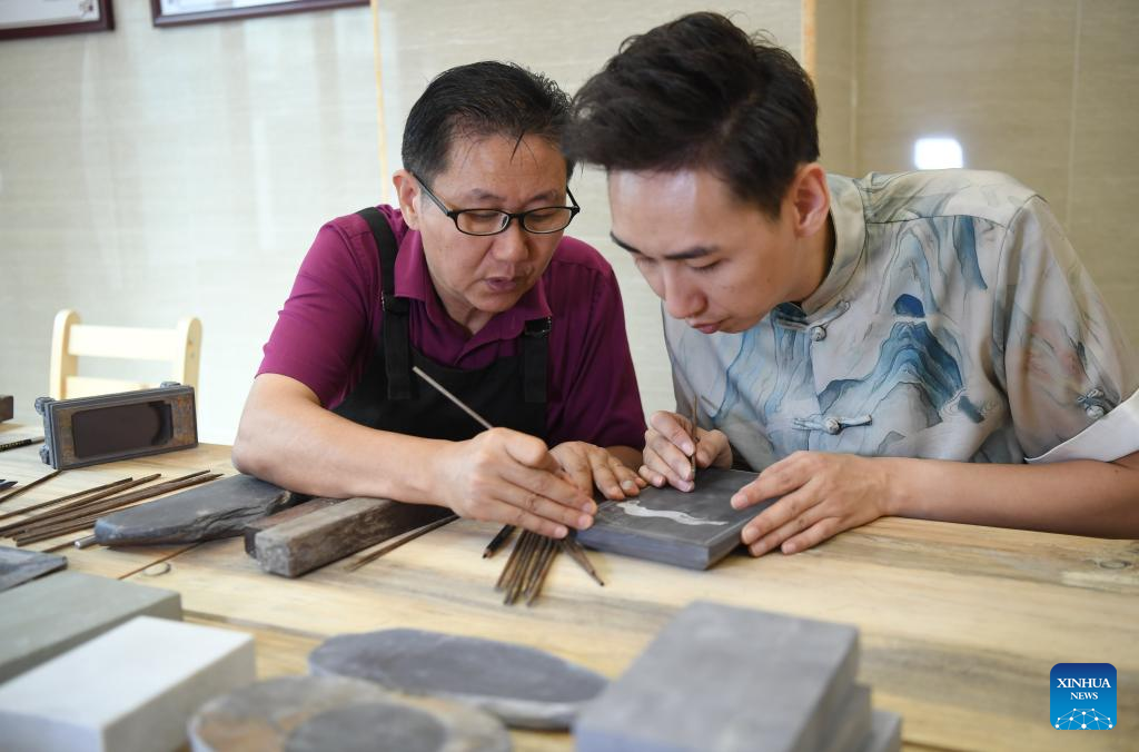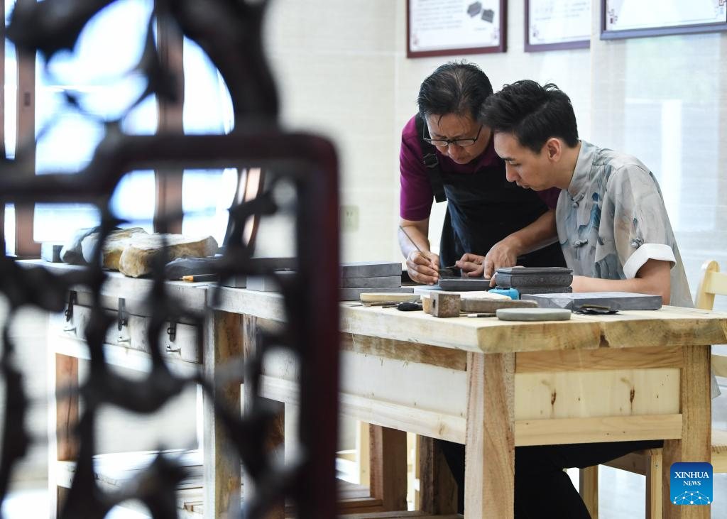 Liu Xinxiang (1st L) introduces the carving of Duan inkstone to an apprentice at a Duan inkstone cultural village in Zhaoqing City, south China's Guangdong Province, Oct. 26, 2023.
