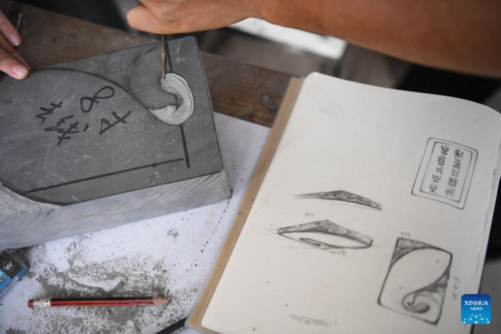 Liu Xinxiang introduces the carving of Duan inkstone according to a designed pattern at a Duan inkstone cultural village in Zhaoqing City, south China's Guangdong Province, Oct. 26, 2023. (Xinhua/Deng Hua)