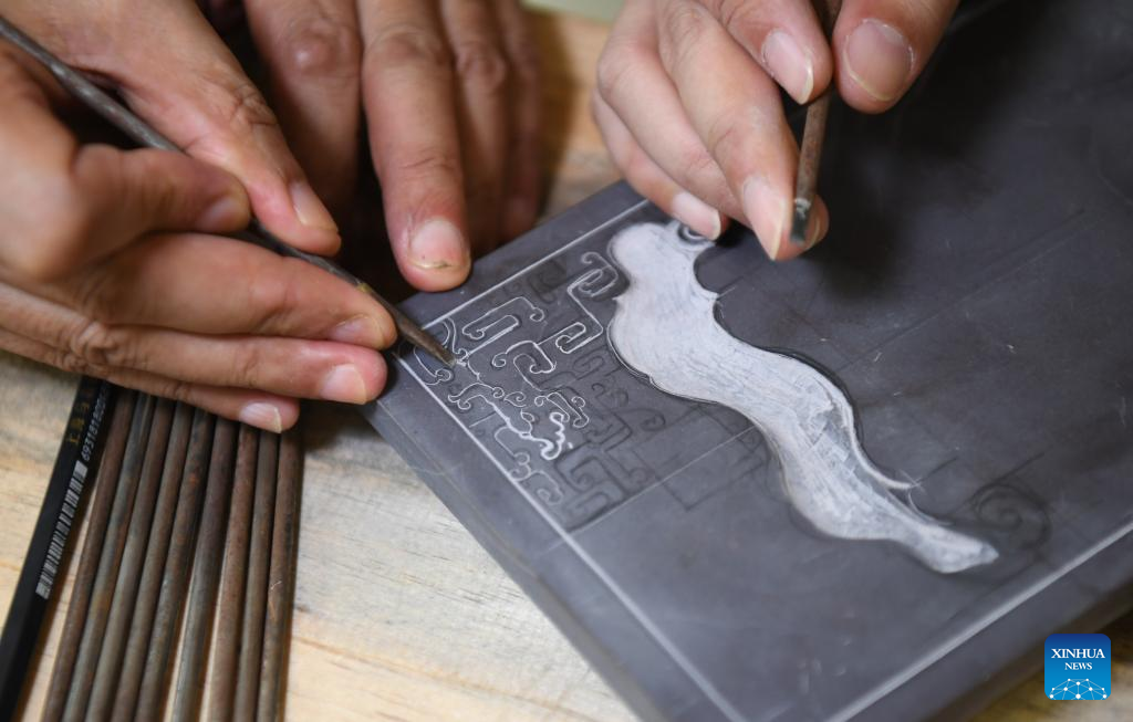 Liu Xinxiang carves on a Duan inkstone at a workshop of his Duan inkstone art gallery in Zhaoqing City, south China's Guangdong Province, Oct. 26, 2023. (Xinhua/Deng Hua)