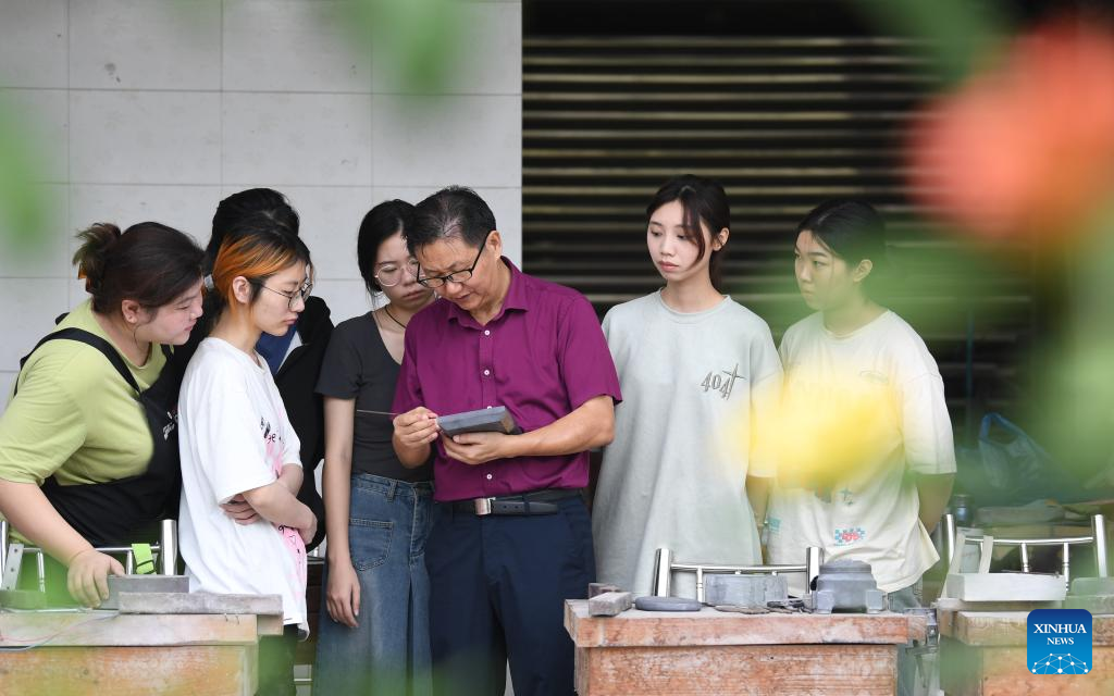 Liu Xinxiang (C) introduces the carving of Duan inkstone to apprentices at a Duan inkstone cultural village in Zhaoqing City, south China's Guangdong Province, Oct. 26, 2023. (Xinhua/Deng Hua)