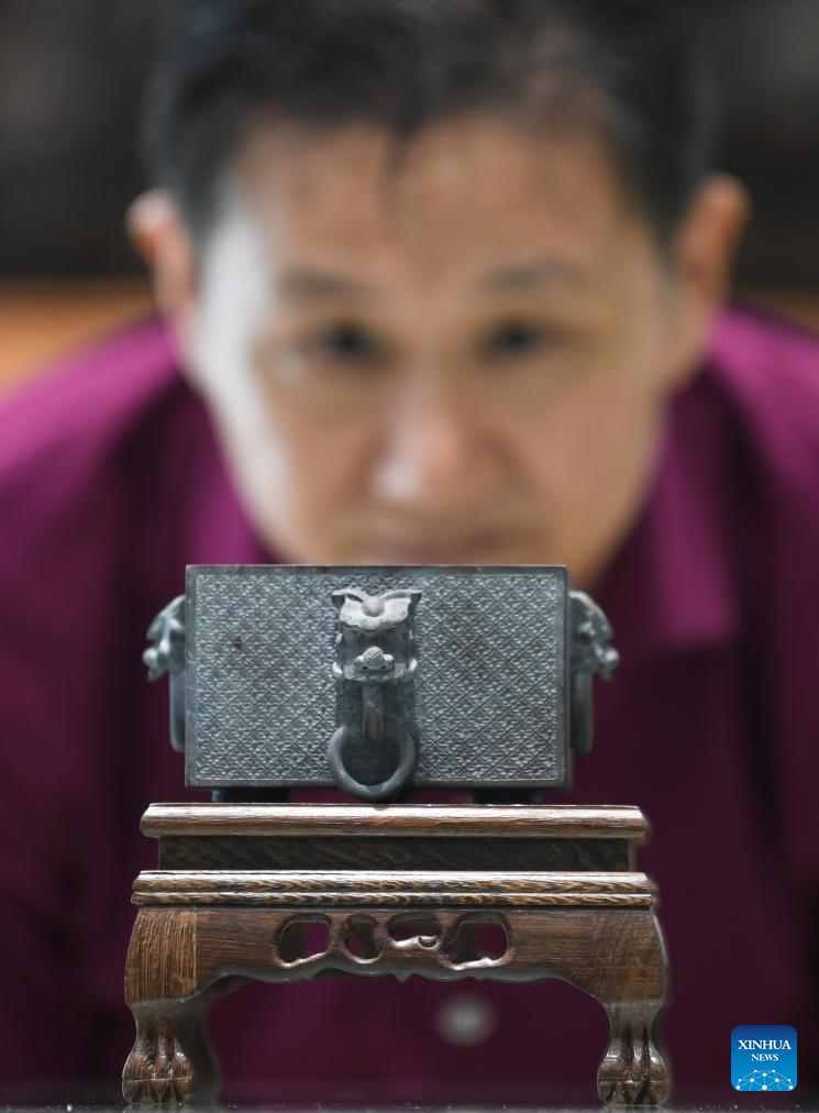 Liu Xinxiang watches a Duan inkstone at his Duan inkstone art gallery in Zhaoqing City, south China's Guangdong Province, Oct. 25, 2023. (Xinhua/Deng Hua)