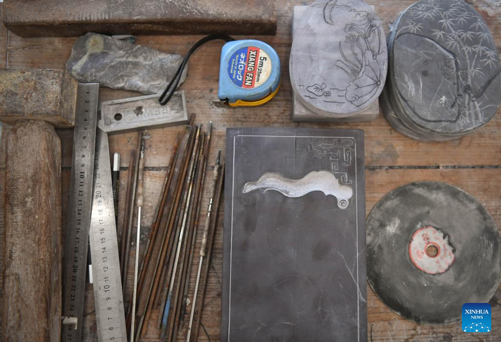 This photo taken on Oct. 26, 2023 shows tools for making Duan inkstone at Liu Xinxiang's Duan inkstone art gallery in Zhaoqing City, south China's Guangdong Province. (Xinhua/Deng Hua)