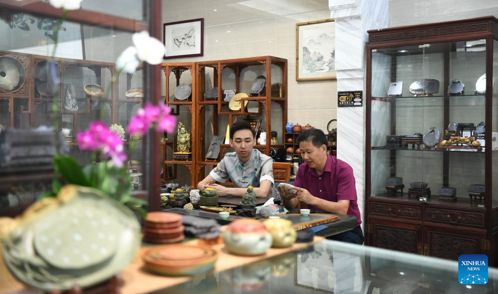 Liu Xinxiang (R) and his son Liu Fei discuss on the making of Duan inkstone at Liu Xinxiang's Duan inkstone art gallery in Zhaoqing City, south China's Guangdong Province, Oct. 26, 2023. (Xinhua/Deng Hua)