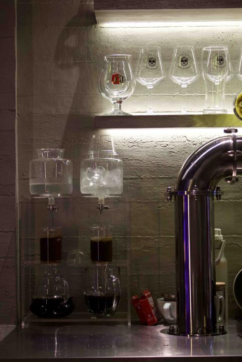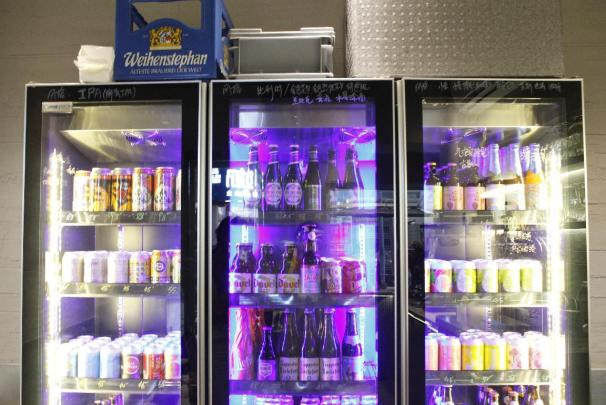 推开玻璃门走入室内,右边是一排开放式吧台,可以看到咖啡师在此进行拉花制作;目光尽头是三个整齐摆满了精酿啤酒的冰柜,绚丽的灯光装饰尽显潮流品味。