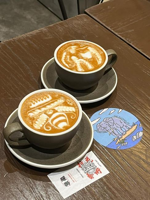 点完单后,咖啡师会向顾客推荐款式多样的拉花。除了常驻的老虎头、舞狮头等以外,小店每隔两三个月就会上新“季节限定”款拉花。记者这次品尝到就是新款的大象和海马。