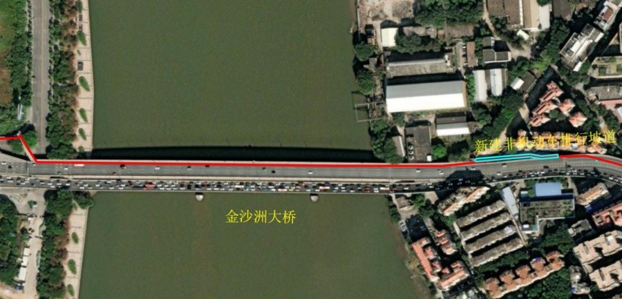 改善金沙洲大桥非机动车通行条件、保障通行安全十分必要以及紧要。在《金沙洲大桥非机动车临时通道改造工程方案设计》(征求意见稿)中提到,由于南侧慢行道两岸梯道分别受到110KV高压电缆管廊和现状彩滨中路限制,不具备改造空间,本次方案主要对北侧慢行道进行改造。金沙洲大桥东往西方向引桥为3车道,主桥为4车道,拟将主桥最北侧机动车道调整为非机动车道,引桥与主桥机动车道通行能力相匹配,并解决人非混行和机非混行问题。并且于东岸新建一条长约100m、宽约3m的临时坡道,连接至金沙洲大桥主桥非机动车道。