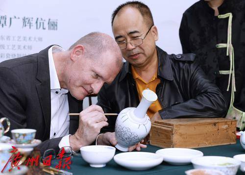 吉乐(左)和谭广辉等嘉宾参与广彩体验环节。