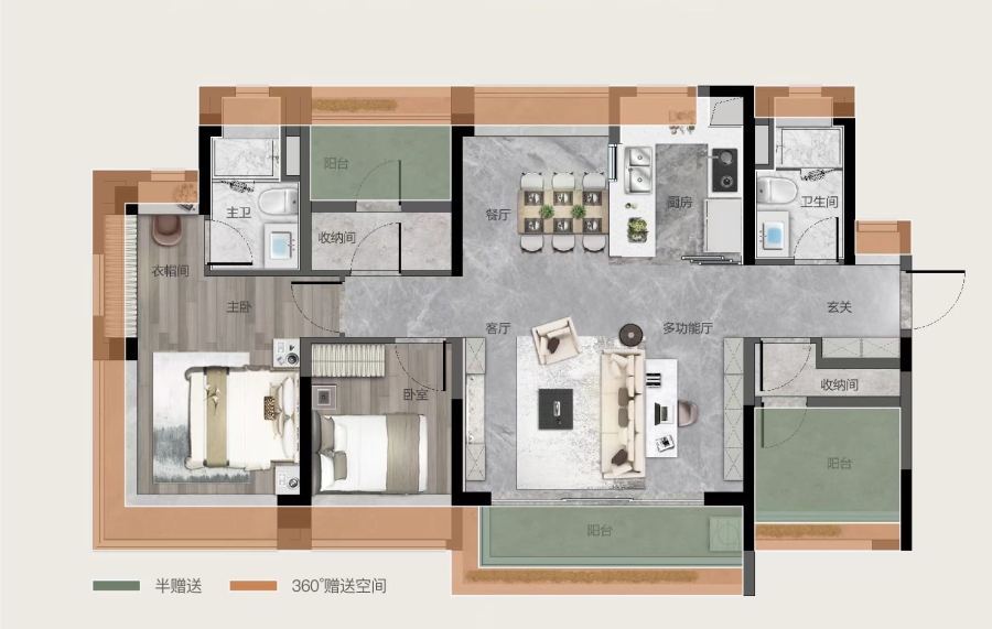 新规对于户内设计最大的改变有两点:其一是半开敞空间进深不大于 2.4米且半开敞空间水平投影面积之和与住宅套内(含半开敞空间水平投影面积)建筑面积的比值从原来的15%增大至 20%。这意味着阳台占比增大 5%,政策原意是鼓励设置入户花园、大进深多功能阳台,鼓励单独设置生活阳台和设备平台,以利于阳台的通风换气、入户消杀要求,同时承载居民休闲、健身、种植等多场景功能,缓解居民对户外环境的需求,也提供用于晾晒、存放蔬菜、设备平台等功能的可能性。但近几年广州热销的户型,阳台更多的是作为可拓展空间,成为“阳改房”。