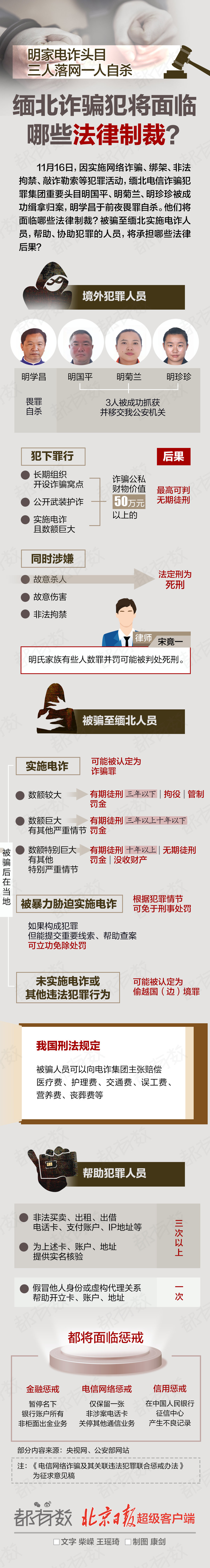11月16日,因实施网络诈骗、绑架、非法拘禁、敲诈勒索等犯罪活动,缅北电信诈骗犯罪集团重要头目明国平、明菊兰、明珍珍被成功缉拿归案,明学昌于前夜畏罪自杀。他们将面临哪些法律制裁?被骗至缅北实施电诈人员,帮助、协助犯罪的人员,将承担哪些法律后果?