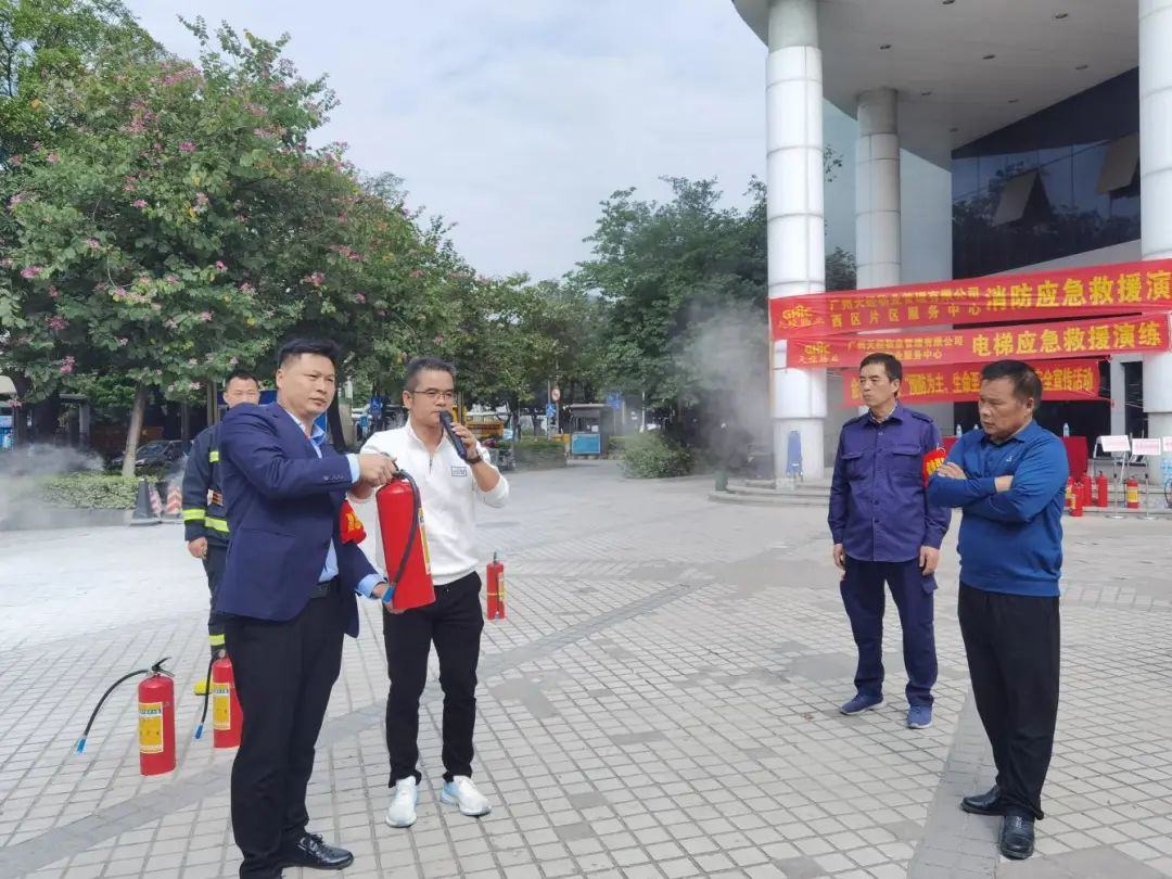 演练结束后,金碧社区党总支书记陈建兵及物业工作人员向参与演练人员讲解并示范如何正确使用消防设备。参与演练人员和其他企业员工现场学习使用灭火器。