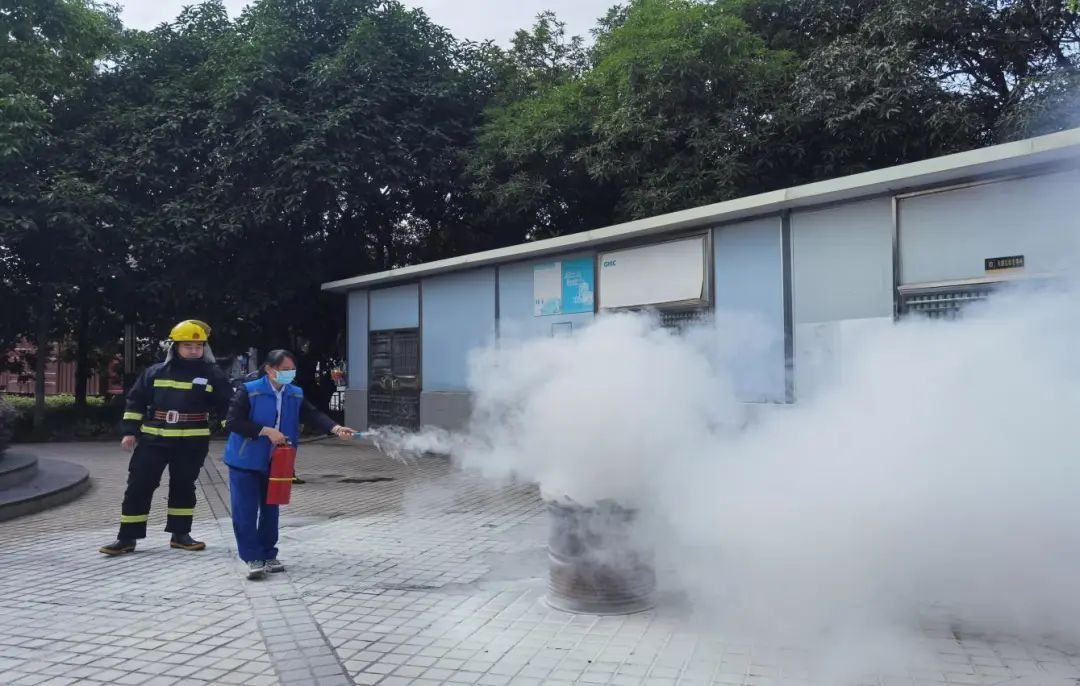 参与演练人员使用灭火器。