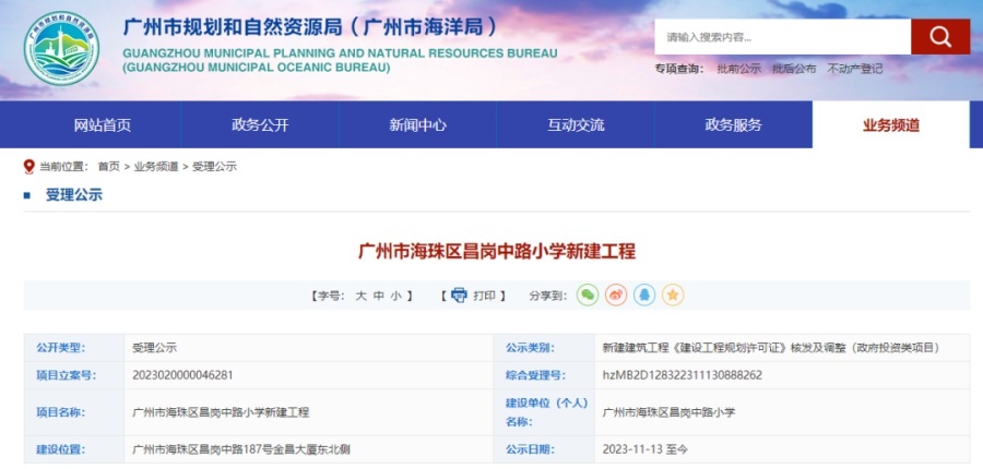 此前,11月13日,广州市规划和自然资源局官网发布了广州市海珠区昌岗中路小学新建工程的受理公示。公示显示,该校新校区位于广州市海珠区昌岗中路187号金昌大厦东北侧。