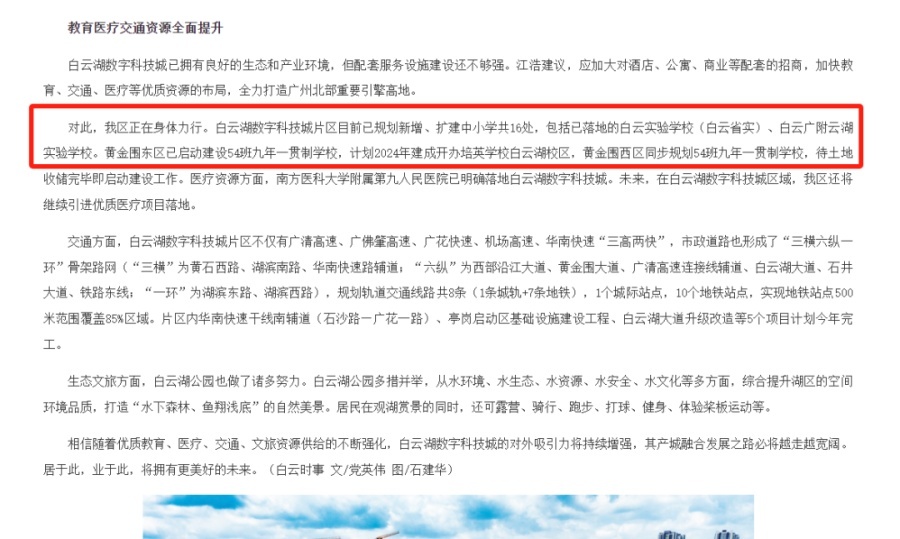 “白云湖数字科技城片区目前已规划新增、扩建中小学共16处,包括已落地的白云实验学校(白云省实)、白云广附云湖实验学校。黄金围东区已启动建设54班九年一贯制学校,计划2024年建成开办培英学校白云湖校区,黄金围西区同步规划54班九年一贯制学校,待土地收储完毕即启动建设工作。”