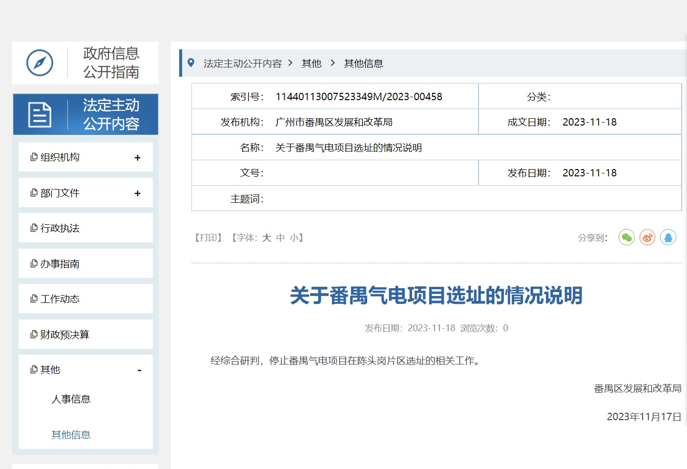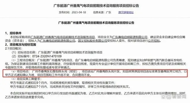 17日,番禺区发展和改革局发布了停止番禺气电项目在陈头岗片区选址的相关工作。