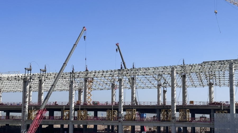 截至目前,白云机场三期扩建工程的T3项目完成主楼A区首块主体结构(编号A1-4区)封顶、首榀钢结构网架顺利完成提升、主楼钢结构花冠柱吊装、指廊屋面网架拼装。目前全面进入主体结构冲刺施工阶段,幕墙、屋面、机电安装等施工单位已进场穿插施工。