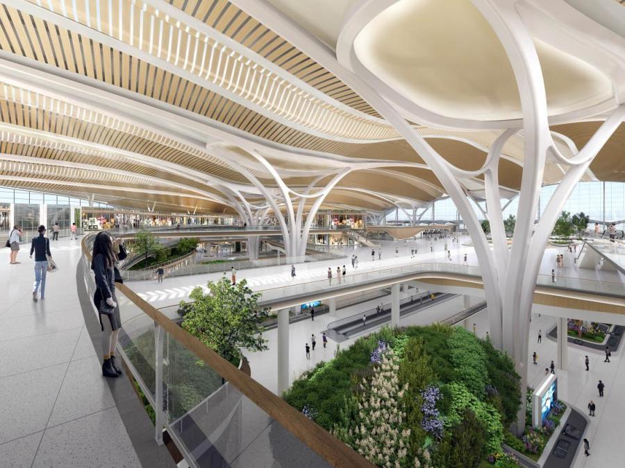 与航站楼一体化设计的综合交通中心,把值机换乘大厅、轨道交通站厅、商业设施、停车楼结合起来,把出港到港流程分层分流,旅客在综合交通中心导向清晰,转乘便捷。
