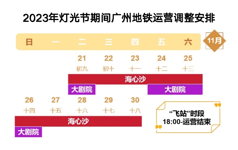 广州地铁提醒,除海心沙站外,邻近活动主会场的APM线大剧院站也将在11月21日、24日-26日18:00至运营结束停止对外服务。