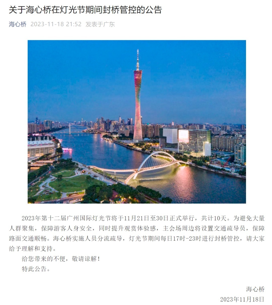 * 为避免大量人群聚集,保障市民游客安全,同时提升观赏体验感,主会场周边将设置交通疏导员,保障路面交通顺畅。海心桥、猎德大桥西侧人行通道实施人员分流疏导,11月21日至11月30日17:00-23:00进行限控管理,请大家给予理解和支持。