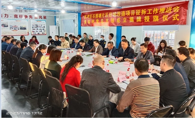 11月16日,广州市荔湾区石围塘片区旧城改造项目推进会暨临时党总支部揭牌授旗仪式在石围塘片区旧城改造项目现场举行。