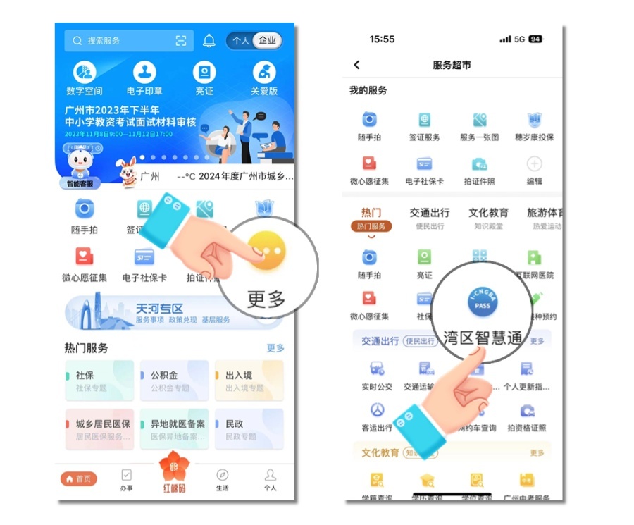 1.打开“穗好办”APP,点击首页“更多”进入服务超市,在“热门”里面选择“湾区智慧通”即可进入购票页面;