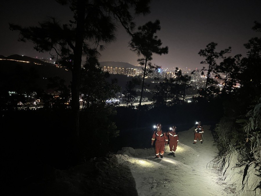 当天18时49分,梅华小型消防站消防救援人员先行到达凤凰山脚。与报警人取得联系后,消防救援人员添加报警人微信,通过打开位置共享确认他们所在具体位置,再按照报警人所用的某款软件内记录的所行路线,携带登山包绳索、定滑轮、担架和水源等救援设备及物资进山进行搜索。