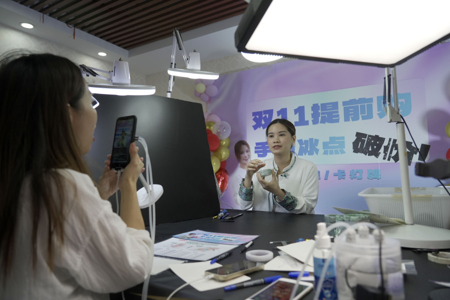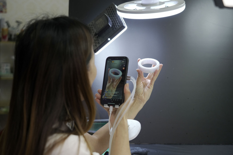 夜晚8点多,桂城平洲小镇的益众珠宝玉器大楼灯火通明,这座大楼迎来了一天中最热闹的时段。在堆满玉镯的柜台前,穿着好看的年轻人,将晶莹剔透的手镯放在手机前,向世界各地的翡翠爱好者直播平洲玉器。