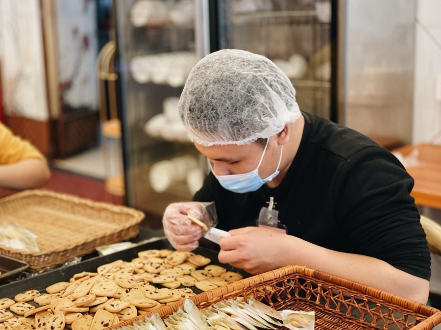 阿浩是2020年来到麦子烘焙从零开始学习烘焙,他从洗托盘做起,再到配原料乃至烤制面包。后来Winnie发现阿浩的记性很好,很适合做烤面包工作,“因为这需要准确记住各种不同面包的上下炉温度、烤制时间以及其他步骤。”2023年3月,契机出现,一位面包师辞职,Winnie决定让阿浩试试直接顶替这位面包师的工作,结果阿浩的工作表现令Winnie感到惊喜。目前,阿浩已经成为一位称职的面包师。