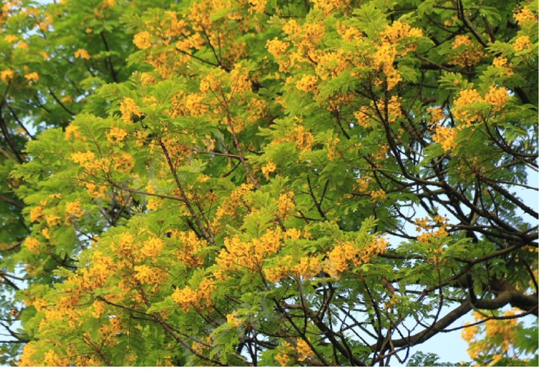 形态特征:常绿乔木,常用遮荫树种之一,树冠茂盛,花黄色,大而芳香,花期3—6月,花期连春接夏,盛花时满树金黄,极具热带风情。