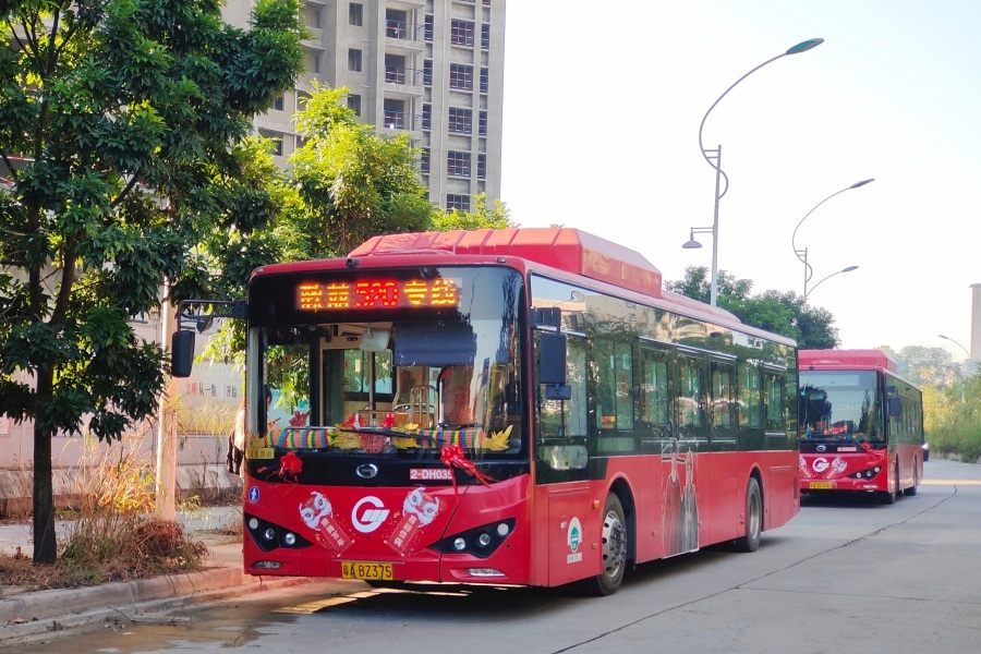 坐着“公交车”结婚是什么感觉?近日清晨,两辆“盛装打扮”的巴士婚车从广州市白云区泽德花苑公交总站缓缓发出。与往日广州公交车的“西关窗”外观涂装不同,两辆巴士婚车别出心裁地进行了喜庆装饰:车头播放“520欢喜专线”专属显示屏,挡风玻璃两侧放置五彩金龙,车身两侧分别展示一对新人的西式以及中式婚纱照,“双喜”窗花配上大红车身,行驶在路上喜气洋洋,格外引人注目。