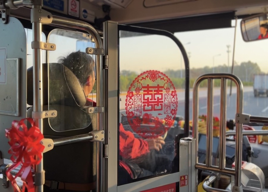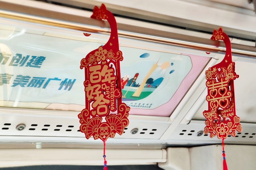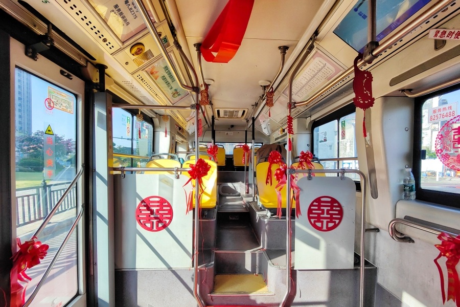 除了精心装扮车身外观,车内也随处可见喜庆元素布置——绣球拉花、喜字中国结、国风双喜挂件等,简约不失浪漫,喜庆氛围拉满。被问到为什么选择巴士作为迎亲婚车,新郎毕先生表示:“通过某社交平台我们看到有租巴士车迎亲的,觉得很新鲜,便联系了巴士公司。巴士婚车相比传统小车车队,容载量大,一台车就可以搞定迎亲环节,还配有专属的司机,安全又实用。”新娘石小姐则表示,她看中巴士婚车气氛热烈的优点:“本身广州巴士红色车身就特别贴合主题,在迎亲路上,车内空间足够宽敞,可以让更多的亲朋好友参与进来,通过大家陪伴见证,制造出更多幸福瞬间。”