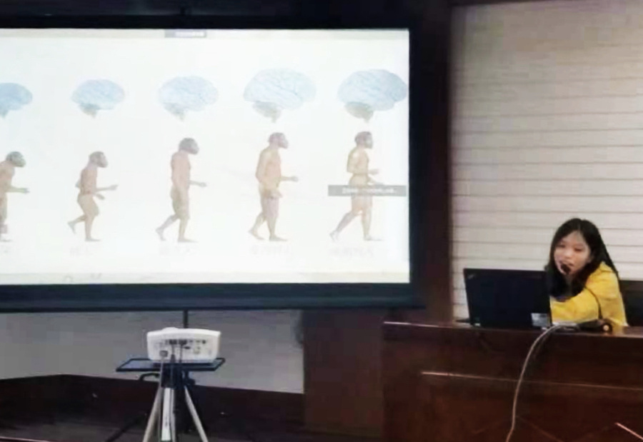 当天的“历史大课堂”分享交流活动上,首先上台讲历史故事的是游泳队队员张玉琦。这名14岁的韶关女孩自信地为大家讲述人类的起源,讲了腊玛古猿、始祖南猿、能人、直立人、早期智人、晚期智人的故事,将人类不懈努力的发展进程娓娓道来,也将自己对运动和竞技的理解融入讲述中,激励着每一名小队员。紧接着,19岁的江门小伙子林彪则用生动的故事介绍了燧人氏、伏羲氏、神农氏,讲述了他们为人类做出的贡献。