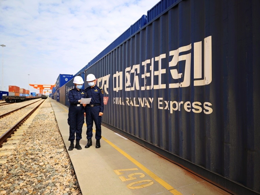 广州海关所属广州车站海关关员对中欧班列集装箱进行监管