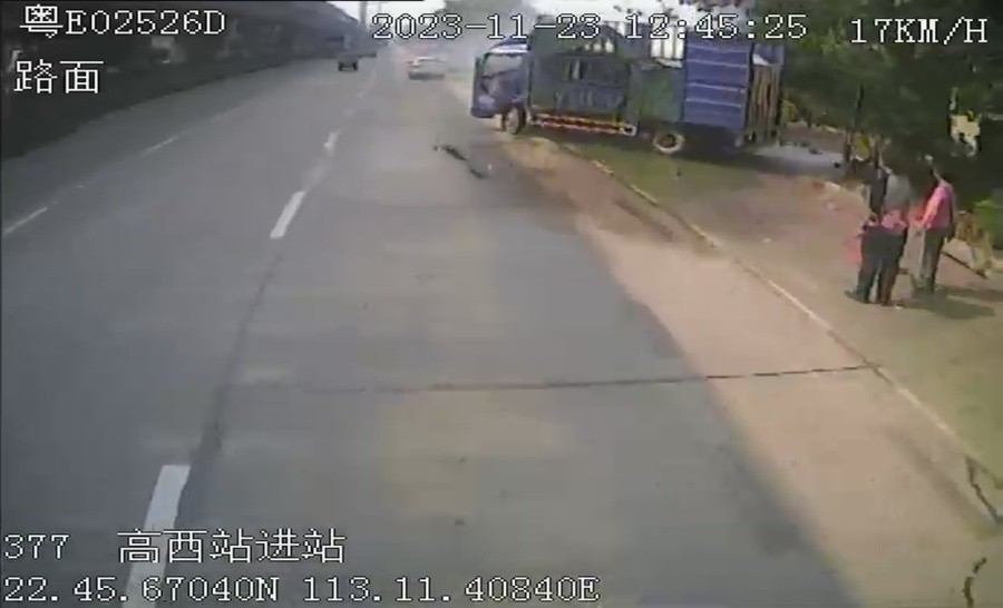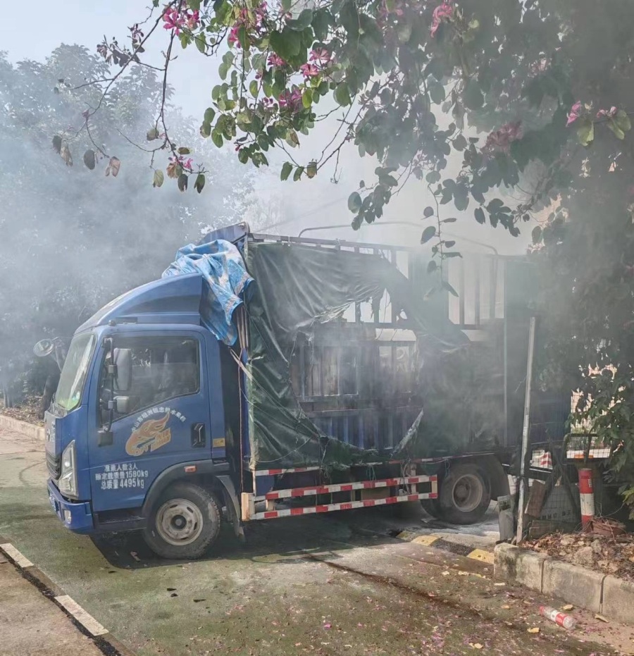 11月23日中午,在佛山市顺德区杏坛高西公交站前方,一辆货车突然起火燃烧,途经此处的顺汽公交容桂车队377线路驾驶员陈言强见状当即挺身而出,使用公交车随车配备的灭火器及时控制火势,止灾挽损。