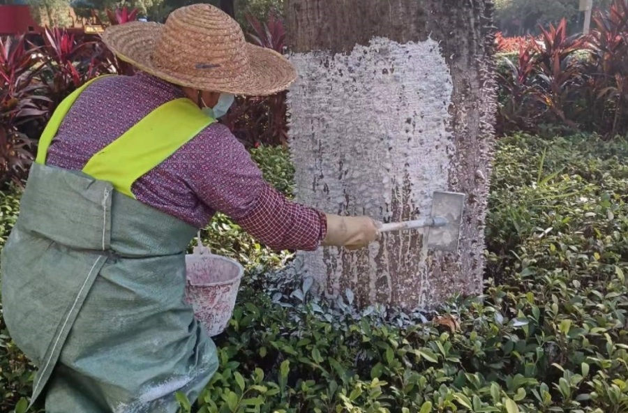 “涂白剂中含有生石灰,能起到杀菌灭虫作用,可有效减少树干树皮中害虫隐匿和滋生,而且有助于树木御寒。现在已经进入了深秋,我们从11月初开始对行道树进行涂白工作,预计12月中旬结束。涂白作业的同时,我们对树木进行修剪、施肥,防治病虫害,并浇灌越冬水,这样能有效保护树木免受低温冻害,提高来年树木长势。”花都区城市管理和综合执法局相关负责人介绍道。