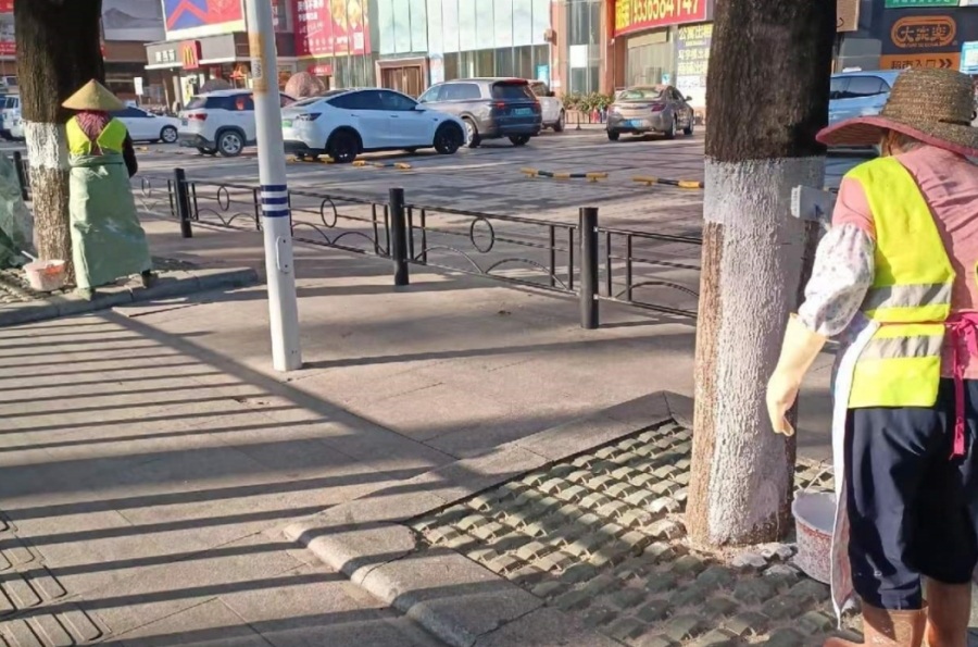 在迎宾大道,可见绿化工人带着装有涂白剂的桶和刷子来到沿路两旁,对行道树进行涂白工作。他们每人分工明确、互相协作,用刷子严格按照统一高度对行道树树干均匀、反复涂白,确保达到整洁美观效果。经过一番耐心操作,这些树木都穿上了整齐美观的白色“新衣”,不仅有效御寒、防治病虫,也成为一道亮丽的风景线。