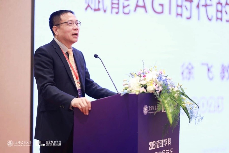 上海财经大学常务副校长徐飞发表主题演讲——赋能AGI时代的战略领导力。徐飞从人工智能带来的风险与挑战出发,谈到在VUCA时代和BANI时代至关重要的“非可编码能力”,并分享了他对系统思考能力、周期穿越力的理解和感悟,闪耀着智慧的光辉。