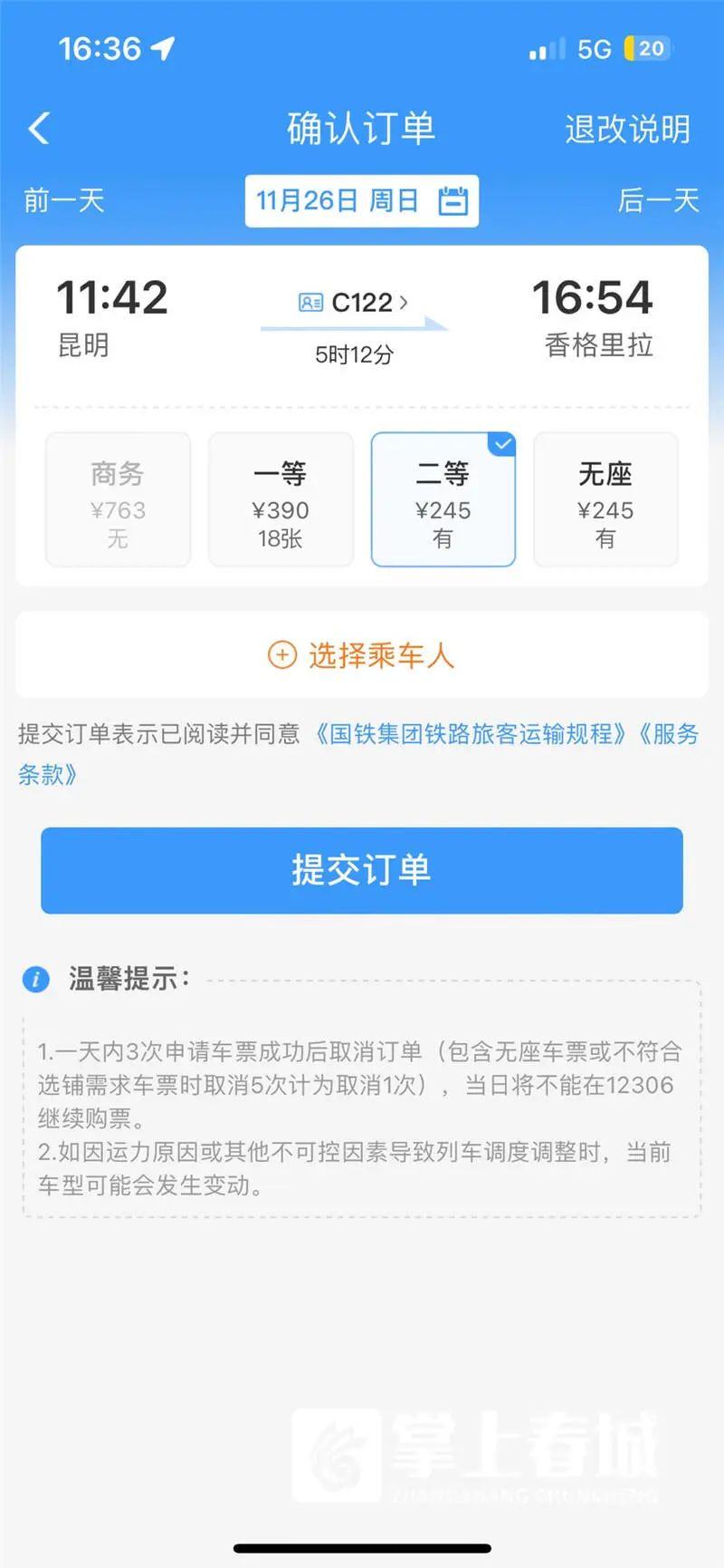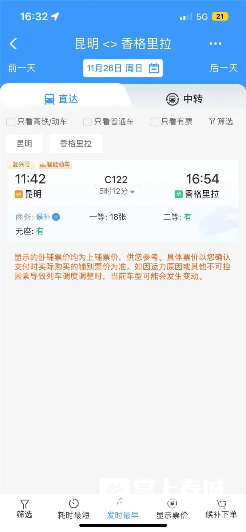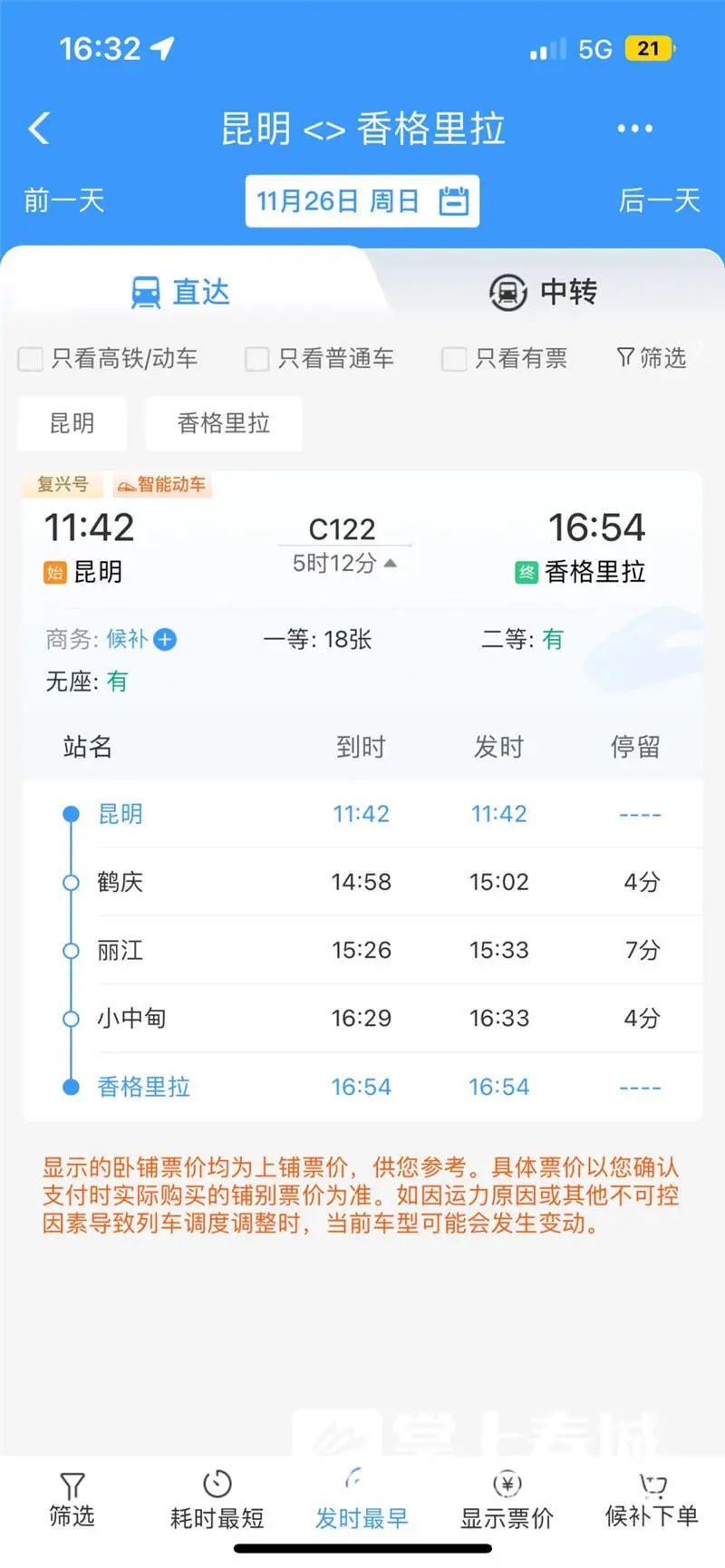 16时32分,中国铁路12306网站显示,昆明至香格里拉列车自11月26日起开行。其中11月26日开行车次为C122,昆明站11时42分开,经停鹤庆、丽江、小中甸,于16时54分到达香格里拉站。票价为二等座245元,一等座390元。截至发稿前,界面显示仍有余票。