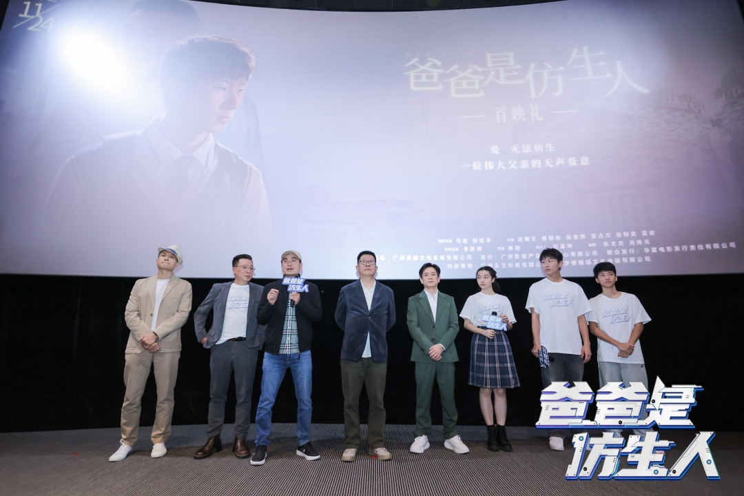 科幻温情题材电影《爸爸是仿生人》11月24日正式上映。11月23日,《爸爸是仿生人》首映礼在广州百丽宫IMAX影城举行。影片出品人、制片人刘富坤,导演林弢,编剧陈文杰、冼炜光,演员刘铭泽、苗占杰、易颖彤、吴俊烨、李跃辉出席了活动,首映礼由广州影视产业服务中心承办。