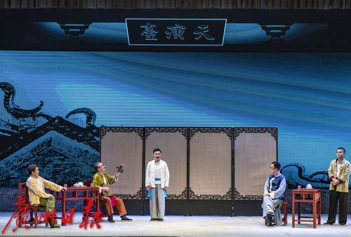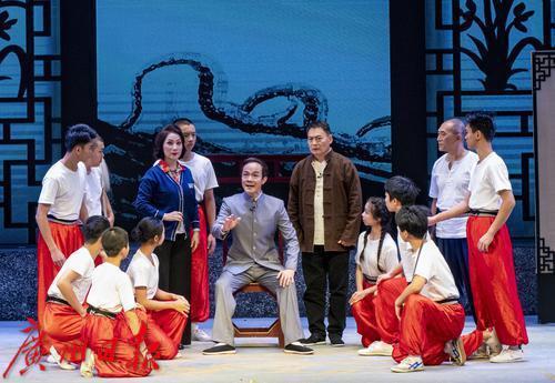 粤剧《一代宗师白驹荣》专场展演,周恩扮演的青年白驹荣在“天演台”拜师学艺。