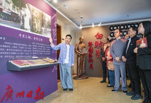 在粤剧《一代宗师白驹荣》中扮演青年白驹荣的演员周恩在白驹荣粤剧艺术展上为观众导览。