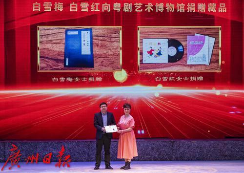 白驹荣的女儿白雪梅、白雪红向粤剧艺术博物馆捐赠了藏品,白雪梅作为代表上台接受馆方颁发的收藏证书。