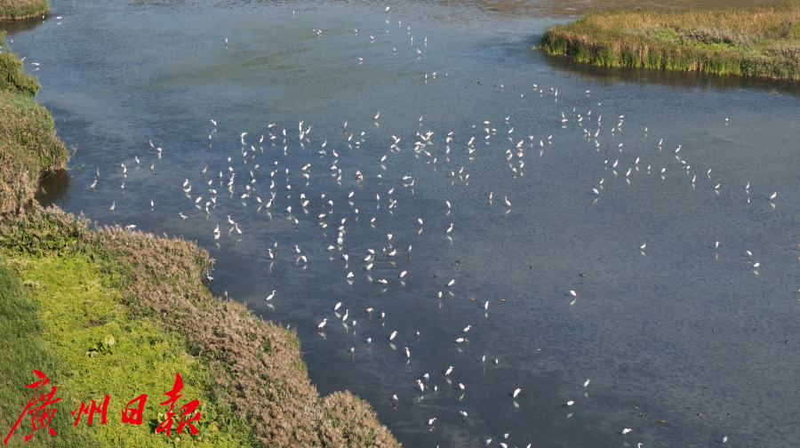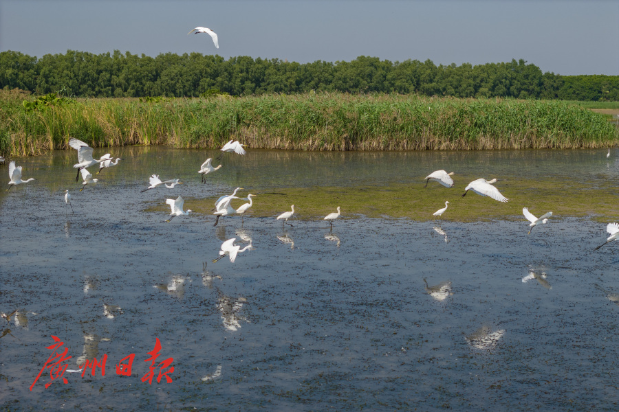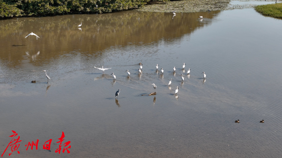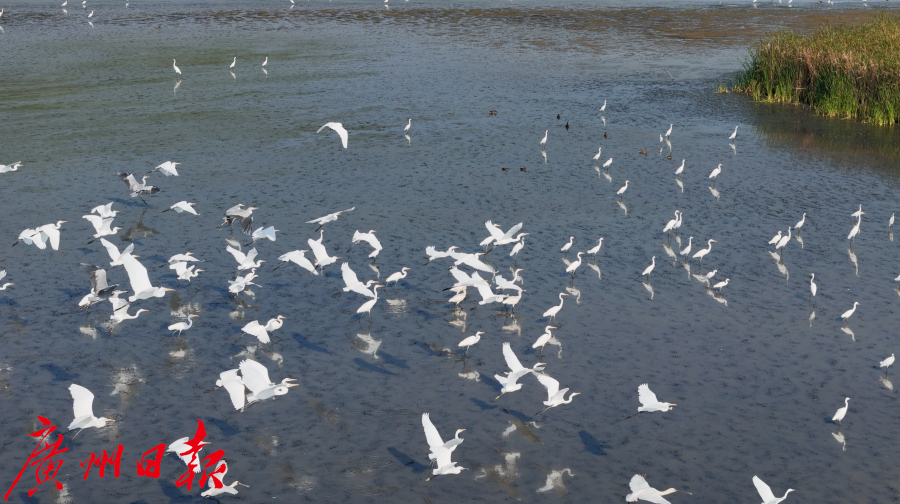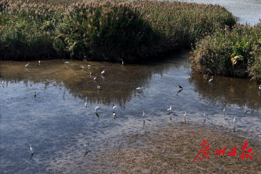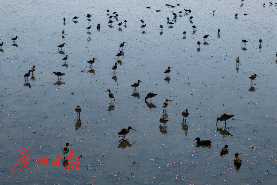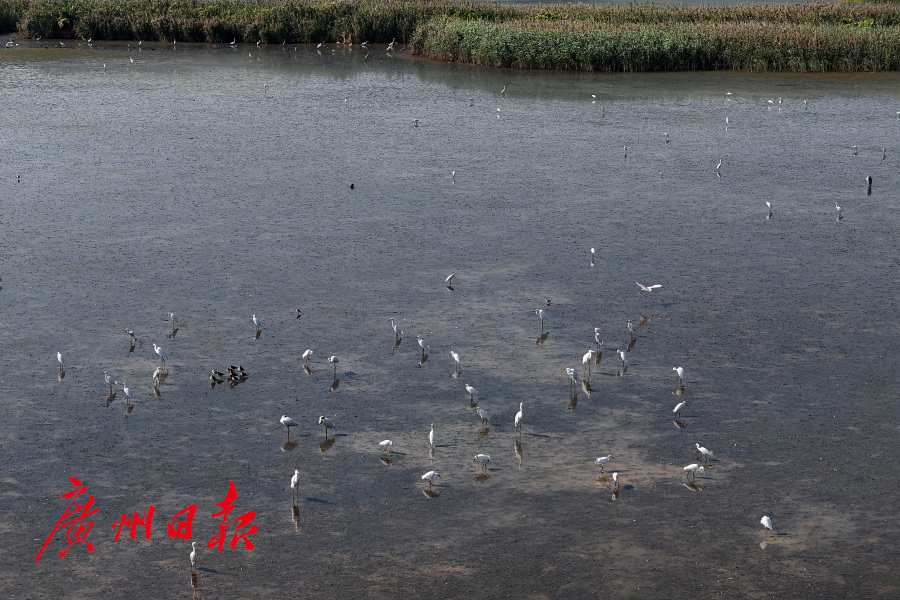 近段时间,南沙湿地又有大批“老朋友”如约而至飞抵。在被俗称为“自助餐厅”的大片浅滩里,成百上千的候鸟降落在此,由于水位较浅、鱼虾肥美,各种各样的鸟类慢悠悠地闲适踱步,自寻“靓座”觅食。