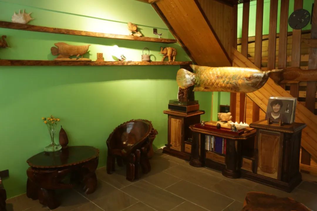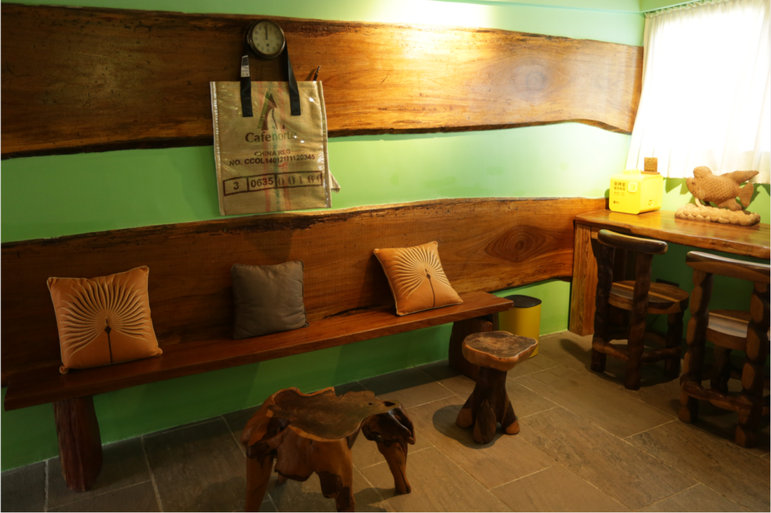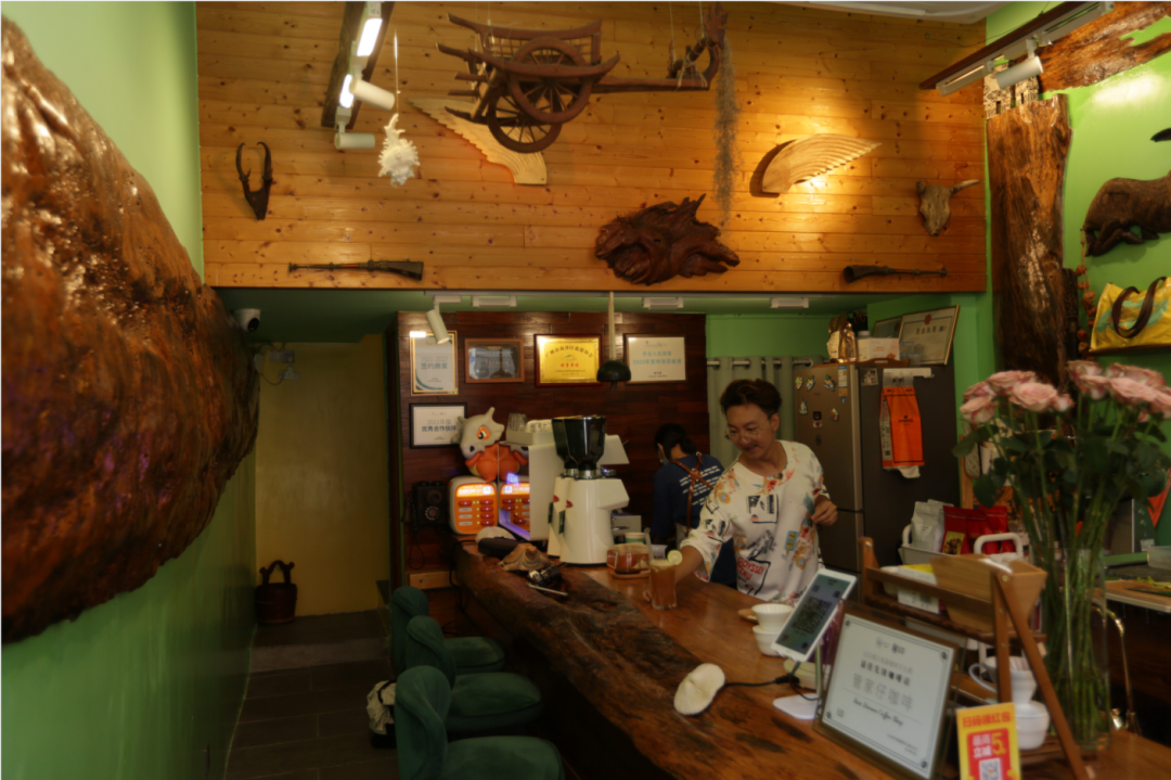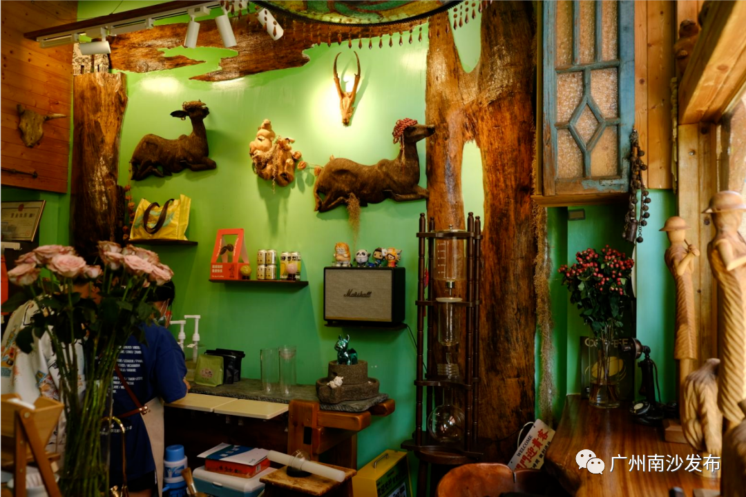 以木雕、园林布景,咖啡店本身即是一个青旅式咖啡共享空间。打开店门后,好像瞬间穿梭到森林里,在这里时间的流逝和外界的喧嚣仿佛都被按下了暂停键。
